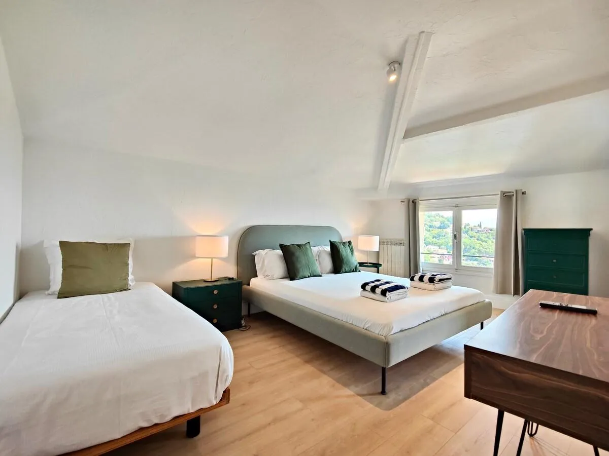 A spacious shared room with two beds, offering sweeping views over the hills and Riviera.